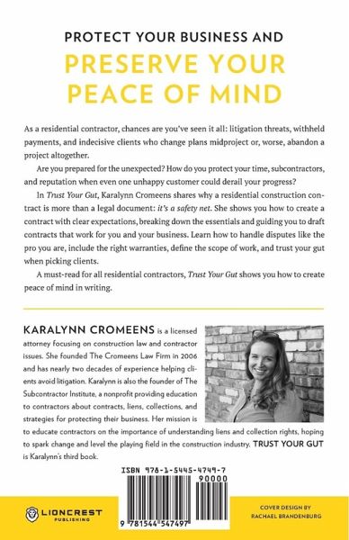 Protect your business and preserve your peace of mind. As a residential contractor, chances are you've seen it all: litigation threats, withheld payments, and indecisive clients who change plans midproject or, worse, abandon a project altogether. Are you prepared for the unexpected? How do you protect your time, subcontractors, and reputation when even one unhappy customer could derail your progress? In Trust Your Gut, Karalynn Cromeens shares why a residential construction contract is more than a legal document: it's a safety net. She shows you how to create a contract with clear expectations, breaking down the essentials and guiding you to draft contracts that work for you and your business. Learn how to handle disputes like the pro you are, include the right warranties, define the scope of work, and trust your gut when picking clients. A must-read for all residential contractors, Trust Your Gut shows you how to create peace of mind in writing.