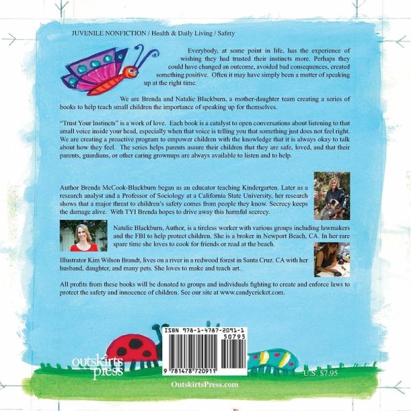 Author Brenda McCook-Blackburn began as an educator teaching Kindergarten. Later as a research analyst and a Professor of Sociology at a California State University, her research shows that a major threat to children's safety comes from people they know. Secrecy keeps the damage alive. With TYI Brenda hopes to drive away this harmful secrecy. Natalie Blackburn, Author, is a tireless worker with various groups including lawmakers and the FBI to help protect children. She is a broker in Newport Beach, CA. In her rare spare time she loves to cook for friends or read at the beach. Illustrator Kim Wilson Brandt, lives on a river in a redwood forest in Santa Cruz. CA with her husband, daughter, and many pets. She loves to make and teach art. All profits from these books will be donated to groups and individuals fighting to create and enforce laws to protect the safety and innocence of children. See our site at www.candycricket.com.