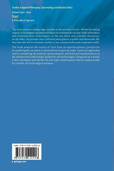 The book analyzes the notion of trust from an interdisciplinary perspective by combining the normative (continental) and empirical (Anglo-American) approaches and by considering the political, epistemological, and historical transformations in the interpersonal relationships sparked by new technologies. Using trust as a model, it then investigates and clarifies the new types of participation that are made possible by scientific and technological advances.