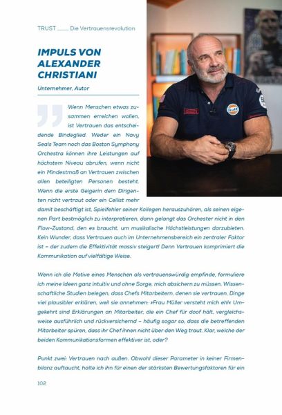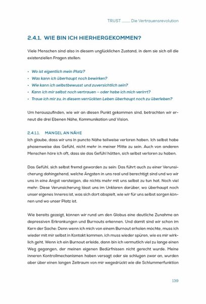 TrustWie Erfolg und innere Erfüllung auf allen Ebenen wieder möglich werden. In uns allen schlummern zwei Urängste: die Angst, nicht geliebt zu werden, und die Sorge, nicht genug zu sein. Tief verwurzelt unter diesen Ängsten liegt das Fundament unseres Daseins - das Vertrauen.In einer Welt, die von Unruhe und Instabilität geprägt ist, präsentiert "Trust - Die Vertrauensrevolution" eine wegweisende Reise zurück zur Essenz des Vertrauens.Durchleuchte mit diesem Buch die vier Schlüsselebenen - Gesellschaft, Unternehmen, Beziehungen sowie die persönliche Ebene. In diesem Buch findest Du klare, inspirierende Wege, wie Du aus dem Netz des Misstrauens ausbrechen und die Leichtigkeit und Erfüllung des Vertrauens zurückgewinnen kannst.Erfahre, wie Vertrauen in die Regierung wieder erblühen kann, wie Unternehmen florieren, wenn Vertrauen als Grundpfeiler etabliert wird. Entdecke, wie tiefe Verbindungen in Familien und Partnerschaften gedeihen, wenn Vertrauen das Herzstück bildet. Und vor allem: Lerne, wie Du Dir selbst vertrauen kannst, um ein Leben voll erfülltem Erfolg zu führen."Trust - Die Vertrauensrevolution" ist mehr als ein Buch. Es ist ein kraftvoller Weckruf, eine Einladung, den Weg des Vertrauens zu beschreiten und somit das Fundament für ein erfülltes, erfolgreiches Leben zu legen. Tauche ein in diese transformative Reise und lass Dich von neuen, mutigen Wegen inspirieren.Die Zeit des Vertrauens ist jetzt.