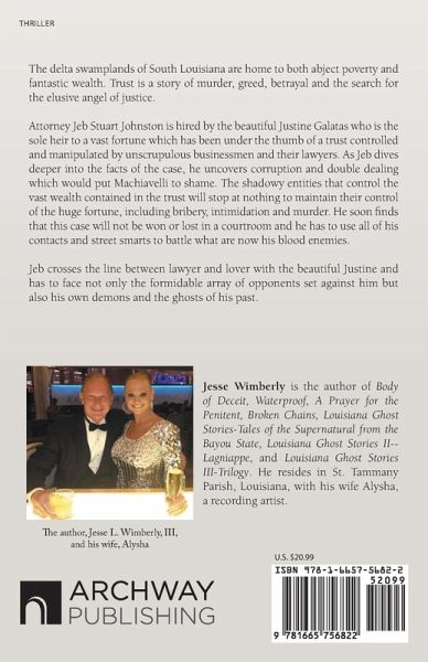 The delta swamplands of South Louisiana are home to both abject poverty and fantastic wealth. Trust is a story of murder, greed, betrayal and the search for the elusive angel of justice. Attorney Jeb Stuart Johnston is hired by the beautiful Justine Galatas who is the sole heir to a vast fortune which has been under the thumb of a trust controlled and manipulated by unscrupulous businessmen and their lawyers. As Jeb dives deeper into the facts of the case, he uncovers corruption and double dealing which would put Machiavelli to shame. The shadowy entities that control the vast wealth contained in the trust will stop at nothing to maintain their control of the huge fortune, including bribery, intimidation and murder. He soon finds that this case will not be won or lost in a courtroom and he has to use all of his contacts and street smarts to battle what are now his blood enemies. Jeb crosses the line between lawyer and lover with the beautiful Justine and has to face not only the formidable array of opponents set against him but also his own demons and the ghosts of his past.