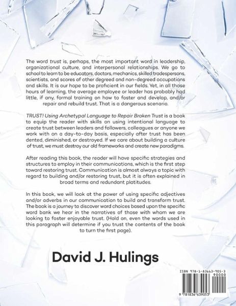 The word trust is, perhaps, the most important word in leadership, organizational culture, and interpersonal relationships. We go to school to learn to be educators, doctors, mechanics, skilled tradespersons, scientists, and scores of other degreed and non-degreed occupations and skills. It is our hope to be proficient in our fields. Yet, in all those hours of learning, the average employee or leader has probably had little, if any, formal training on how to foster and develop, and/or repair and rebuild trust. That is a dangerous scenario. TRUST! Using Archetypal Language to Repair Broken Trust is a book to equip the reader with skills on using intentional language to create trust between leaders and followers, colleagues or anyone we work with on a day-to-day basis, especially after trust has been dented, diminished, or destroyed. If we care about building a culture of trust, we must destroy our old frameworks and create new paradigms. After reading this book, the reader will have specific strategies and structures to employ in their communications, which is the first step toward restoring trust. Communication is almost always a topic with regard to building and/or restoring trust, but it is often explained in broad terms and redundant platitudes. In this book, we will look at the power of using specific adjectives and/or adverbs in our communication to build and transform trust. The book is a journey to discover word choices based upon the specific word bank we hear in the narratives of those with whom we are looking to foster enjoyable trust. (Hold on, even the words used in this paragraph will determine if you trust the contents of the book to turn the first page.)