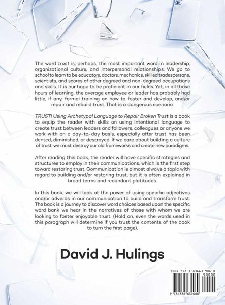 The word trust is, perhaps, the most important word in leadership, organizational culture, and interpersonal relationships. We go to school to learn to be educators, doctors, mechanics, skilled tradespersons, scientists, and scores of other degreed and non-degreed occupations and skills. It is our hope to be proficient in our fields. Yet, in all those hours of learning, the average employee or leader has probably had little, if any, formal training on how to foster and develop, and/or repair and rebuild trust. That is a dangerous scenario. TRUST! Using Archetypal Language to Repair Broken Trust is a book to equip the reader with skills on using intentional language to create trust between leaders and followers, colleagues or anyone we work with on a day-to-day basis, especially after trust has been dented, diminished, or destroyed. If we care about building a culture of trust, we must destroy our old frameworks and create new paradigms. After reading this book, the reader will have specific strategies and structures to employ in their communications, which is the first step toward restoring trust. Communication is almost always a topic with regard to building and/or restoring trust, but it is often explained in broad terms and redundant platitudes. In this book, we will look at the power of using specific adjectives and/or adverbs in our communication to build and transform trust. The book is a journey to discover word choices based upon the specific word bank we hear in the narratives of those with whom we are looking to foster enjoyable trust. (Hold on, even the words used in this paragraph will determine if you trust the contents of the book to turn the first page.)