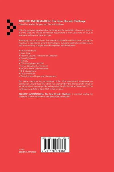 Since the early eighties IFIP/Sec has been an important rendezvous for Information Technology researchers and specialists involved in all aspects of IT security. The explosive growth of the Web is now faced with the formidable challenge of providing trusted information. IFIP/Sec'01 is the first of this decade (and century) and it will be devoted to "Trusted Information - the New Decade Challenge" This proceedings are divided in eleven parts related to the conference program. Session are dedicated to technologies: Security Protocols, Smart Card, Network Security and Intrusion Detection, Trusted Platforms. Others sessions are devoted to application like eSociety, TTP Management and PKI, Secure Workflow Environment, Secure Group Communications, and on the deployment of applications: Risk Management, Security Policies andTrusted System Design and Management. The year 2001 is a double anniversary. First, fifteen years ago, the first IFIP/Sec was held in France (IFIP/Sec'86, Monte-Carlo) and 2001 is also the anniversary of smart card technology. Smart cards emerged some twenty years ago as an innovation and have now become pervasive information devices used for highly distributed secure applications. These cards let millions of people carry a highly secure device that can represent them on a variety of networks. To conclude, we hope that the rich "menu" of conference papers for this IFIP/Sec conference will provide valuable insights and encourage specialists to pursue their work in trusted information.