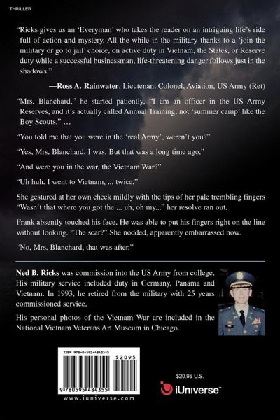 "Ricks gives us an 'Everyman' who takes the reader on an intriguing life's ride full of action and mystery. All the while in the military thanks to a 'join the military or go to jail' choice, on active duty in Vietnam, the States, or Reserve duty while a successful businessman, life-threatening danger follows just in the shadows." Ross A. Rainwater, Lieutenant Colonel, Aviation, US Army (Ret) "Mrs. Blanchard," he started patiently, "I am an officer in the US Army Reserves, and it's actually called Annual Training, not 'summer camp' like the Boy Scouts." . "You told me that you were in the 'real Army', weren't you?" "Yes, Mrs. Blanchard, I was. But that was a long time ago." "And were you in the war, the Vietnam War?" "Uh huh. I went to Vietnam, ... twice." She gestured at her own cheek mildly with the tips of her pale trembling fingers "Wasn't that where you got the ... uh, oh my..." her resolve ran out.
