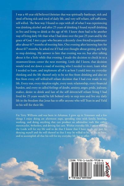 I was a 40 year old believer/christian that was spiritually bankrupt, sick and tired of being sick and tired of daily life, and very self reliant, self sufficient, self willed. The best way I found to cope with all of what I was experiencing was drinking alcohol and after 25 years of drinking I found myself drinking to live and living to drink at the age of 40. I knew there had to be another way of living daily life than what I had done over the past 25 years and by the grace of God. I met a guy who became a decently close friend/acquaintance after about 6/7 months of meeting him. One evening after knowing him for about 6/7 months, he asked me if I had ever thought about getting any help to stop drinking. My answer to him that evening was no, but after talking about it for a little while that evening, I made the decision to check in to a treatment/detox center the next morning. Little did I know, that decision would send me down a road of meeting who I needed to meet, learn what I needed to learn, and implement all of it as best I could into my everyday thinking and the life thereof only to be set free from drinking and also set free from every self willed/self reliant decision that I had ever made in my life. Every tear, every sleepless night, every toxic relationship, every financial burden, and every so called feelings of doubt, anxiety, anger, pride, jealousy, malice, desire to drink and lust of the self driven/self reliant living I had lived for 25 years would be left behind only to step into and live my daily life in the freedom that Jesus has to offer anyone who will Trust in and Yield to his will for their life. I'm Terry Williams and was born in Arkansas. I grew up in Tennessee and a few things I enjoy doing are afternoon naps, spending time with family, bowling, working, and doing anything that can produce an adrenaline rush like riding motorcycles, 4wheelers, and driving fast cars. Within everyday life, I enjoy seeking the Lords will for my life and to do that I know that I have to do my part by denying myself and the will thereof so that I may be willed to be, to do, to have, and to accomplish all that his will for my everyday life has to offer.