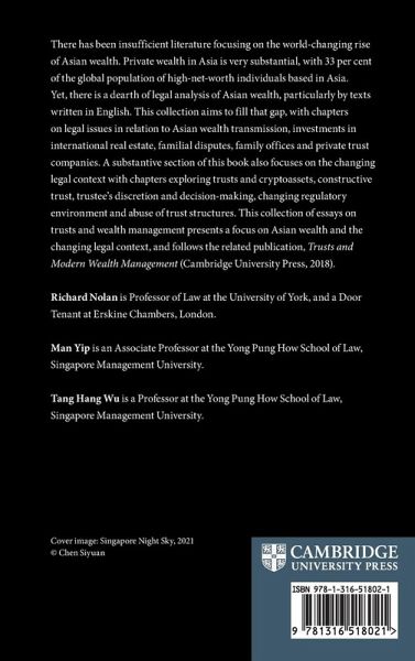 1. Introduction Richard Nolan, Tang Hang Wu, Yip Man and 2. Family trusts today Lady Mary Arden; Section 1. The Rise of Asian Wealth: 3. Asian wealth in the United States: Some legal answers and policy questions Thomas P Gallanis; 4. Regulation of residential property in the west: The impact of Chinese money Edward S W Ti; 5. An Asian approach to mental capacity for wills and lasting powers Lusina Ho; 6. Testamentary freedom and wealth disputes in Hong Kong Rebecca Lee; 7. Crazy rich families in Singapore: Property, trust and business disputes and the incompatibility of English principles Yip Man and Tang Hang Wu; 8. Family offices, private trust companies and trust integrity issues: Problems and solutions Vincent Ooi and Chan Ee Lin; Section 2. The Changing Legal Context: 9. Trusts of cryptoassets Kelvin F. K. Low; 10. Pragmatic modernisation? Judicial directions in trusts and wealth management James Lee; 11. Decision making in trusts - applying Wednesbury reasonableness following Braganza David Pollard; 12. Trustee decision-making in the Australian superannuation context Tobias Barkley; 13. Trusts and UWOs: Unpacking the 'holding' requirement puzzle Simone Wong; 14. Constructive trusts on express trusts: Principles under threat Jessica Palmer; 15. Abuse of trust Graham Virgo.