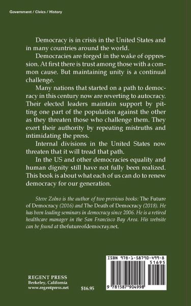 Democracy is in crisis in the United States and in many countries around the world. Democracies are forged in the wake of oppression. At first there is trust among those with a common cause. But maintaining unity is a continual challenge. Many nations that started on a path to democracy in this century now are reverting to autocracy. Their elected leaders maintain support by pitting one part of the population against the other as they threaten those who challenge them. They exert their authority by repeating mistruths and intimidating the press. Internal divisions in the United States now threaten that it will tread that path. In the US and other democracies equality and human dignity still have not fully been realized. In every generation we must renew our commitment to democratic principles and their meaning for our time.