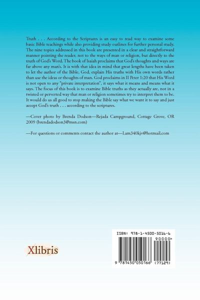 Truth...According to the Scriptures is an easy to read way to examine some basic Bible teachings while also providing study outlines for further personal study. The nine topics addressed in this book are presented in a clear and strightforward manner pointing the reader, not to the ways of man or religion, but directly to the truth of God¿s Word. The book of Isaiah proclaims that God¿s thoughts and ways are far above any man¿s and it is with that idea in mind that great lengths have been taken to let the author of the Bible, God, explain His truths with His own words rather than use the ideas or thoughts of man. God proclaims in II Peter 1:20 that His Word is not open to any "private interpretation", it says what it means and means what it says, it doesn¿t say one thing to one person and something else to another. The focus of this book is to examine Bible truths as they actually are, not in a twisted or perverted way that man or religion sometimes try to interpret them to be. It would do us all good to stop making the Bible say what we want it to say and just accept God¿s truth...according to the scriptures.