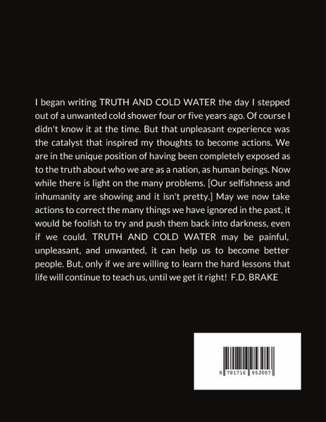 I began writing TRUTH AND COLD WATER the day I stepped out of an unwanted cold shower four or five years ago. Coldwater leaves no doubt that it is real when you're standing in it. Some have gone to great effort to shape truth into a more palatable story than the reality in which we live. But, truth is much more resilience and like cold water, it can be a shock to one's system. TRUTH AND COLD WATER Is a collection of poems written from my heart about my experiences in life. Experiences that will provoke thought, it will hopefully raise awareness, and inspire hope for a brighter future as well as entertain.