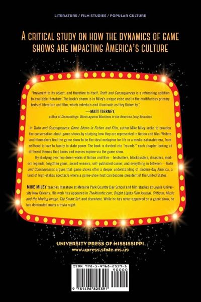 Although nearly every other television form or genre has undergone a massive critical and popular reassessment or resurgence in the past twenty years, the game show's reputation has remained both remarkably stagnant and remarkably low. Scholarship on game shows concerns itself primarily with the history and aesthetics of the form, and few works assess the influence the format has had on American society or how the aesthetics and rhythms of contemporary life model themselves on the aesthetics and rhythms of game shows. In Truth and Consequences: Game Shows in Fiction and Film, author Mike Miley seeks to broaden the conversation about game shows by studying how they are represented in fiction and film. Writers and filmmakers find the game show to be the ideal metaphor for life in a media-saturated era, from selfhood to love to family to state power. The book is divided into "rounds," each chapter looking at different themes that books and movies explore via the game show. By studying over two dozen works of fiction and film--bestsellers, blockbusters, disasters, modern legends, forgotten gems, award winners, self-published curios, and everything in between--Truth and Consequences argues that game shows offer a deeper understanding of modern-day America, a land of high-stakes spectacle where a game-show host can become president of the United States.