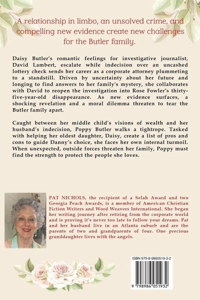 An unsolved crime, revealing new evidence, and the possibility of wealth risk splitting the Butler family apart. Daisy Butler's growing feelings for investigative journalist, David Lambert, escalate while an uncashed check sends her career plummeting to a standstill. Driven by uncertainty about her future and longing to find answers to her family's mystery, she collaborates with David to reopen the investigation into Rose Fowler's thirty-five-year-old disappearance. New evidence about her grandmother's death and a surprise visit trigger a troublesome lawsuit. Does Michael Warner volunteer to take the case to protect his firm's interests, or is he driven by lingering romantic feelings for Daisy? Caught between her middle child's ambition and her husband's indecision, Poppy Butler walks a tightrope. Tasked with helping her oldest daughter, Daisy, create a list of pros and cons to guide Danny's choice, she faces her own internal turmoil. When unexpected, outside forces threaten her family, Poppy must find the strength to protect the people she loves. An intriguing and powerful story of family loyalty.