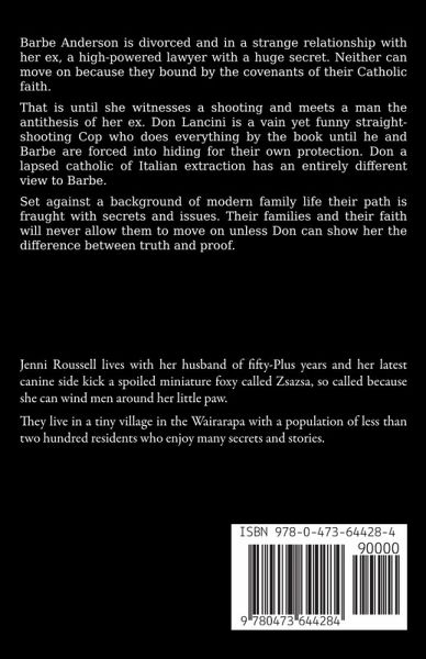 Barbe Anderson is divorced and in a strange relationship with her ex, a high-powered lawyer with a huge secret. Neither can move on because they bound by the covenants of their Catholic faith. That is until she witnesses a shooting and meets a man the antithesis of her ex. Don Lancini is a vain yet funny straight shooting cop who does everything by the book until he and Barbe are forced into hiding for their own protection. Don a lapsed catholic of Italian extraction has an entirely different view to Barbe. Set against a background of modern family life in New Zealand their path is fraught with secrets and issues. Their families and their faith will never allow them to move on unless Don can show her the difference between truth and proof.