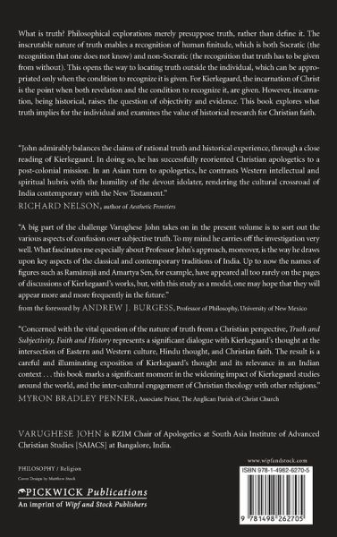 Description: What is truth? Philosophical explorations have merely presupposed truth, rather than define it. The inscrutable nature of truth is a recognition of human finitude, which is both Socratic (the recognition that one does not know) and non-Socratic (the recognition that truth has to be given from without). This opens the way to locating truth outside the individual, which can be appropriated only when the condition to recognize it is given. For Kierkegaard, the incarnation of Christ is the point when both revelation and the condition to recognize it, are given. However, incarnation, being historical, raises the question of objectivity and evidence. This book explores what truth implies for the individual and examines the value of historical research for Christian faith. Endorsements: ""John admirably balances the claims of rational truth and historical experience, through a close reading of Kierkegaard. In doing so, he has successfully reoriented Christian apologetics to a postcolonial mission. In an Asian turn to apologetics, he contrasts Western intellectual and spiritual hubris with the humility of the devout idolater, rendering the cultural crossroad of India contemporary with the New Testament."" --Richard Nelson author of Aesthetic Frontiers ""A big part of the challenge Varughese John takes on in the present volume is to sort out the various aspects of confusion over subjective truth. To my mind he carries off the investigation very well. What fascinates me especially about Professor John's approach, moreover, is the way he draws upon key aspects of the classical and contemporary traditions of India. Up to now the names of figures such as Ram¿nuj¿ and Amartya Sen, for example, have appeared all too rarely on the pages of discussions of Kierkegaard's works, but, with this study as a model, one may hope that they will appear more and more frequently in the future."" --from the foreword by Andrew J. Burgess Professor of Philosophy University of New Mexico ""Concerned with the vital question of the nature of truth from a Christian perspective, Truth and Subjectivity, History and Faith represents a significant dialogue with Kierkegaard's thought at the intersection of Eastern and Western culture, Hindu thought, and Christian faith. The result is a careful and illuminating exposition of Kierkegaard's thought and its relevance in an Indian context . . . this book marks a significant moment in the widening impact of Kierkegaard studies around the world, and the intercultural engagement of Christian theology with other religions."" --Myron Bradley Penner Associate Priest The Anglican Parish of Christ Church About the Contributor(s): Varughese John is RZIM Chair of Apologetics at South Asia Institute of Advanced Christian Studies [SAIACS] at Bangalore, India.