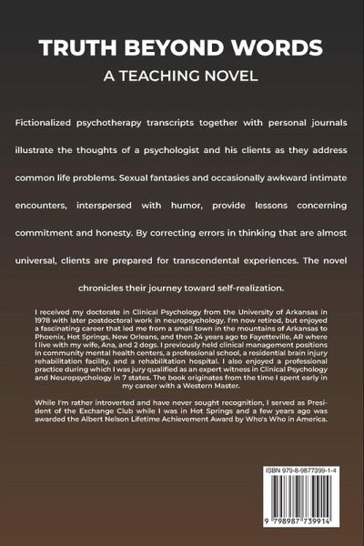 Fictionalized psychotherapy transcripts together with personal journals illustrate the thoughts of a psychologist and his clients as they address common life problems. Sexual fantasies and occasionally awkward intimate encounters, interspersed with humor, provide lessons concerning commitment and honesty. By correcting errors in thinking that are almost universal, clients are prepared for transcendental experiences. The novel chronicles their journey toward self-actualization.