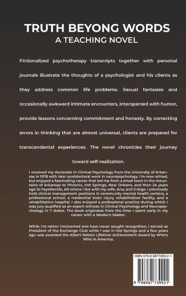 Fictionalized psychotherapy transcripts together with personal journals illustrate the thoughts of a psychologist and his clients as they address common life problems. Sexual fantasies and occasionally awkward intimate encounters, interspersed with humor, provide lessons concerning commitment and honesty. By correcting errors in thinking that are almost universal, clients are prepared for transcendental experiences. The novel chronicles their journey toward self-actualization.
