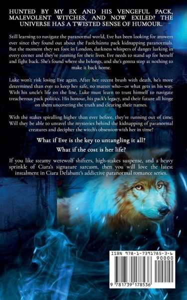 "If The Vampire Diaries and Teen Wolf had an Irish baby, it would be The Hybrid Wolf Series." Hunted by my ex and his vengeful pack, malevolent witches, and now exiled? The universe has a twisted sense of humour. Still learning to navigate the paranormal world, Eve has been looking for answers ever since they found out about the Faolchúnna pack kidnapping paranormals. But the moment they set foot in London, darkness whispers of danger lurking in every corner and they're running for their lives. Eve needs to stand up for herself and fight back. She's found where she belongs, and she's gonna stop at nothing to make it back home. Luke won't risk losing Eve again. After her recent brush with death, he's more determined than ever to keep her safe, no matter who-or what gets in his way. With his uncle's life on the line, Luke must learn to trust himself to navigate treacherous pack politics. His honour, his pack's legacy, and their future all hinge on them uncovering the truth and clearing their names. With the stakes spiralling higher than ever before, they're running out of time. Will they be able to unravel the mysteries behind the kidnapping of paranormal creatures and decipher the witch's obsession with her in time? What if Eve is the key to untangling it all? What if the cost is her life? If you like steamy werewolf shifters, high-stakes suspense, and a heavy sprinkle of Ciara's signature sarcasm, then you will love the latest instalment in Ciara Delahunt's addictive paranormal romance series.