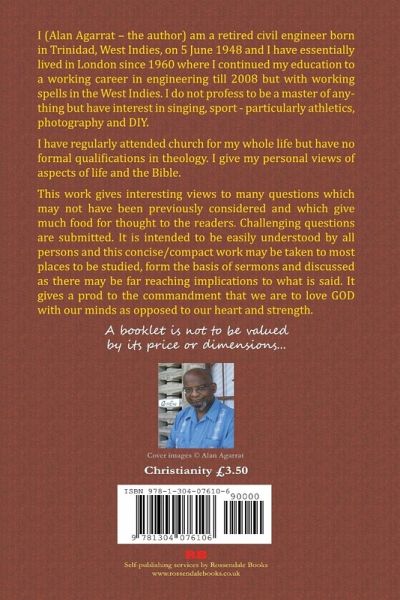 I am a retired civil engineer born in Trinidad, West Indies, on 5 June 1948 and I have lived in London since 1960 where I continued my education to a working career in engineering till 2008 but with working spells in the West Indies. I do not profess to be a master of anything but have interest in singing, sport - particularly athletics, photography and DIY. I have regularly attended church for my whole life but have no formal qualifications in theology. I give my personal views of aspects of life and the Bible. This work gives interesting views to many questions which may not have been previously considered and much food for thought to the readers. Challenging questions are submitted. It is easily understood by all persons and this concise/compact work can be studied anywhere and form the basis of sermons and discussed as there may be far reaching implications to what is said. It gives a prod to the commandment that we are to love GOD with our minds as opposed to our heart and strength.
