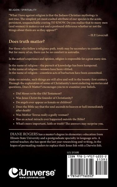 "What I have against religion is that the Judaeo-Christian mythology is not true. The simplest yet most exalted attribute of our species is the acute, persistent, unquenchable craving TO KNOW. Do you realize that to many men (and women) it makes a vast and a profound difference whether or not the things about them are as they appear?" -H.P. Lovecraft Does truth matter? For those who follow a religious path, truth may be secondary to comfort. But for many of us, there can be no comfort in untruths. In the author's experience and opinion, religion is responsible for a great many sins. In the name of religion-the pursuit of knowledge has been hampered. In the name of religion-women have been vilified. In the name of religion-countless acts of barbarism have been committed. Make no mistake, such things are still alive and well in the twenty-first century. Through the exploration of some of Christianity's most enduring mysteries and questions, Does It Matter? encourages you to re-examine your beliefs. Did Moses write the Old Testament? Was Jesus Christ the founder of Christianity? Do angels ever appear as female or children? Does the Bible say that the soul ascends to heaven or hell immediately after death? Was Mother Teresa really a godly woman? Has an actual miracle ever happened outside the Bible? What's more important, faith or truth? The answers may surprise you.