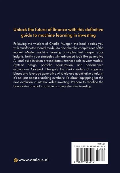 Unlock the future of finance with this definitive guide to machine learning in investing. Following the wisdom of Charlie Munger, the book equips you with multifaceted mental models to decipher the complexities of the market. Master machine learning principles that sharpen your insights, fortify your strategies with advanced tools like generative AI, and build intuition around data's nuanced role in your models. Systems design, portfolio optimization, and performance evaluation? Covered. Navigate the murky waters of cognitive biases and leverage generative AI to elevate quantitative analysis. It's not just about crunching numbers; it's about equipping for the next evolution in intrinsic value investing. Prepare to redefine the boundaries of what's possible in comprehensive investing.