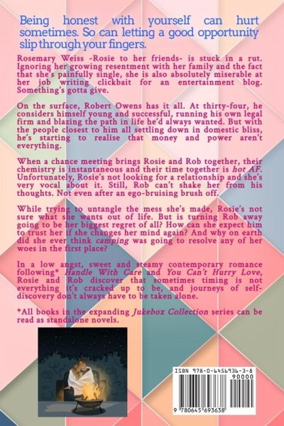 Being honest with yourself can hurt sometimes. So can letting a good opportunity slip through your fingers. Rosemary Weiss -Rosie to her friends- is stuck in a rut. Ignoring her growing resentment with her family and the fact that she's painfully single, she is also absolutely miserable at her job writing clickbait for an entertainment blog. Something's gotta give. On the surface, Robert Owens has it all. At thirty-four, he considers himself young and successful, running his own legal firm and blazing the path in life he'd always wanted. But with the people closest to him all settling down in domestic bliss, he's starting to realise that money and power aren't everything. When a chance meeting brings Rosie and Rob together, their chemistry is instantaneous and their time together is hot AF. Unfortunately, Rosie's not looking for a relationship and she's very vocal about it. Still, Rob can't shake her from his thoughts. Not even after an ego-bruising brush off. While trying to untangle the mess she's made, Rosie's not sure what she wants out of life. But is turning Rob away going to be her biggest regret of all? How can she expect him to trust her if she changes her mind again? And why on earth did she ever think camping was going to resolve any of her woes in the first place? In a low angst, sweet and steamy contemporary romance following* Handle With Care and You Can't Hurry Love, Rosie and Rob discover that sometimes timing is not everything it's cracked up to be, and journeys of self-discovery don't always have to be taken alone. *All books in the expanding Jukebox Collection series can be read as standalone novels.