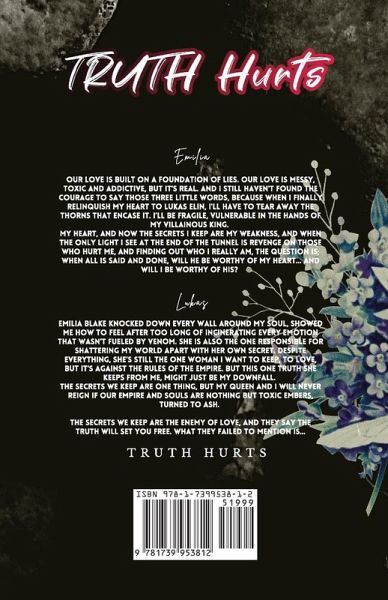 EMILIA Our love is built on a foundation of lies. Our love is messy, toxic and addictive, but it's real. And I still haven't found the courage to say those three little words, because when I finally relinquish my heart to Lukas Elin, I'll have to tear away the thorns that encase it. I'll be fragile, vulnerable in the hands of my villainous King. My heart, and now the secrets I keep are my weakness, and when the only light I see at the end of the tunnel is revenge on those who hurt me, and finding out who I really am, the question is; when all is said and done, will he be worthy of my heart... and will I be worthy of his? LUKAS Emilia Blake knocked down every wall around my soul, showed me how to feel after too long of incinerating every emotion that wasn't fueled by venom. She is also the one responsible for shattering my world apart with her own secret. Despite everything, she's still the one woman I want to keep, to love, but it's against the rules of The Empire. But this one truth she keeps from me, might just be my downfall. The secrets we keep are one thing, but my queen and I will never reign if our Empire and souls are nothing but toxic embers, turned to ash. The Secrets We Keep are the enemy of love, and they say the truth will set you free. what they failed to mention is... TRUTH HURTS.