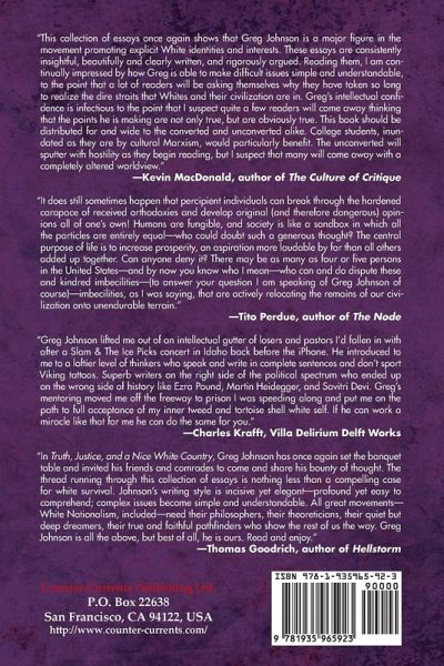 "This collection of essays once again shows that Greg Johnson is a major figure in the movement promoting explicit White identities and interests. These essays are consistently insightful, beautifully and clearly written, and rigorously argued. Reading them, I am continually impressed by how Greg is able to make difficult issues simple and understandable, to the point that a lot of readers will be asking themselves why they have taken so long to realize the dire straits that Whites and their civilization are in. Greg's intellectual confidence is infectious to the point that I suspect quite a few readers will come away thinking that the points he is making are not only true, but are obviously true. This book should be distributed far and wide to the converted and unconverted alike. College students, inundated as they are by cultural Marxism, would particularly benefit. The unconverted will sputter with hostility as they begin reading, but I suspect that many will come away with a completely altered worldview." -Kevin MacDonald, author of The Culture of Critique