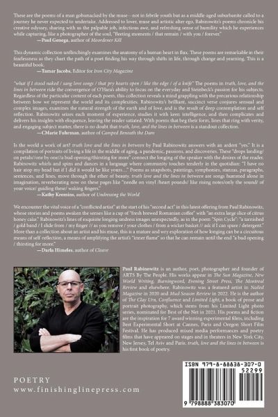 Paul Rabinowitz is an author, poet, photographer and founder of ARTS By The People. His works appear in The Sun Magazine, New World Writing, Burningword, Evening Street Press, The Montreal Review and elsewhere. Rabinowitz was a featured artist in Nailed Magazine in 2020 and Mud Season Review in 2022. He is the author of The Clay Urn, Confluence and Limited Light, a book of prose and portrait photography, which stems from his Limited Light photo series, nominated for Best of the Net in 2021. His poems and fiction are the inspiration for 7 award winning experimental films, including Best Experimental Short at Cannes, Paris and Oregon Short Film Festival. He has produced mixed media performances and poetry films that have appeared on stages and in theaters in New York City, New Jersey, Tel Aviv and Paris. truth, love and the lines in between is his first book of poetry.