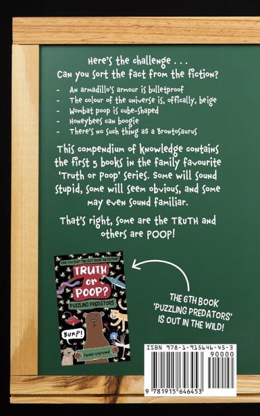 The bestselling TRUE or FALSE Quiz Books that'll keep you guessing to the end for fans of National Geographic Kids Weird but True books. This compendium of knowledge contains the first five books in the family-favourite Truth or Poop Series. Here's the challenge - can you sort the fact from the fiction? ¿ BOOK ONE - Amazing Animals ¿The closest living relative to the T-Rex is a chicken Some worms can jump Hippos can run faster than humans ¿ BOOK TWO - Spectacular Space ¿The colour of the universe is, officially, beige A day on Venus is longer than a year on Venus If you fell into a black hole, you would get stretched out like spaghetti ¿ BOOK THREE - Gloriously Gross ¿Scientists have made a pill that will make your poo smell like chocolate. Farts exit your body at 7 mph. Ear wax isn't wax. It would be more accurate to call it ear snot. ¿ BOOK FOUR - Incredible Insects ¿Honeybees can boogie The loudest animal in the world is a 2 cm long prawn Some tiny spiders wear water droplets as hats ¿ BOOK FIVE - Dangerous Dinosaurs ¿The jaw strength of a Tyrannosaurus Rex was over 10 times more powerful than a lion. There is no such thing as a Brontosaurus. In Colorado, USA, there is a small town called Dinosaur. This boxed set contains 250 facts. Some will sound stupid, some will seem obvious, and some may even sound familiar. But you've got to think long and hard to work out which are real and which are complete nonsense. That's right, some are the TRUTH and others are POOP! This is the perfect gift for inquisitive children that will widen their knowledge and keep them entertained and amazed for HOURS!