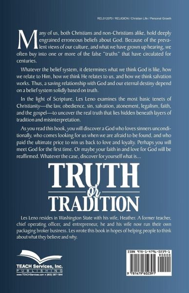 Many of us, both Christians and non-Christians alike, hold deeply engrained erroneous beliefs about God. Because of the prevalent views of our culture, and what we have grown up hearing, we often buy into one or more of the false "truths" that have circulated for centuries. Whatever the belief system, it determines what we think God is like, how we relate to Him, how we think He relates to us, and how we think salvation works. Thus, a saving relationship with God and our eternal destiny depend on a belief system solidly based on truth. In the light of Scripture, Les Leno examines the most basic tenets of Christianity-the law, obedience, sin, salvation, atonement, legalism, faith, and the gospel-to uncover the real truth that lies hidden beneath layers of tradition and misinterpretation. As you read this book, you will discover a God who loves sinners unconditionally, who comes looking for us when we are afraid to be found, and who paid the ultimate price to win us back to love and loyalty. Perhaps you will meet God for the first time. Or maybe your faith in and love for God will be reaffirmed. Whatever the case, discover for yourself what is Truth or Tradition.