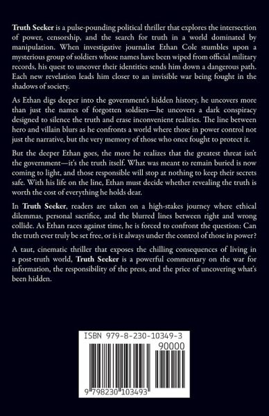 Truth Seeker is a pulse-pounding political thriller that explores the intersection of power, censorship, and the search for truth in a world dominated by manipulation. When investigative journalist Ethan Cole stumbles upon a mysterious group of soldiers whose names have been wiped from official military records, his quest to uncover their identities sends him down a dangerous path. Each new revelation leads him closer to an invisible war being fought in the shadows of society. As Ethan digs deeper into the government's hidden history, he uncovers more than just the names of forgotten soldiers-he uncovers a dark conspiracy designed to silence the truth and erase inconvenient realities. The line between hero and villain blurs as he confronts a world where those in power control not just the narrative, but the very memory of those who once fought to protect it. But the deeper Ethan goes, the more he realizes that the greatest threat isn't the government-it's the truth itself. What was meant to remain buried is now coming to light, and those responsible will stop at nothing to keep their secrets safe. With his life on the line, Ethan must decide whether revealing the truth is worth the cost of everything he holds dear. In Truth Seeker, readers are taken on a high-stakes journey where ethical dilemmas, personal sacrifice, and the blurred lines between right and wrong collide. As Ethan races against time, he is forced to confront the question: Can the truth ever truly be set free, or is it always under the control of those in power? A taut, cinematic thriller that exposes the chilling consequences of living in a post-truth world, Truth Seeker is a powerful commentary on the war for information, the responsibility of the press, and the price of uncovering what's been hidden.