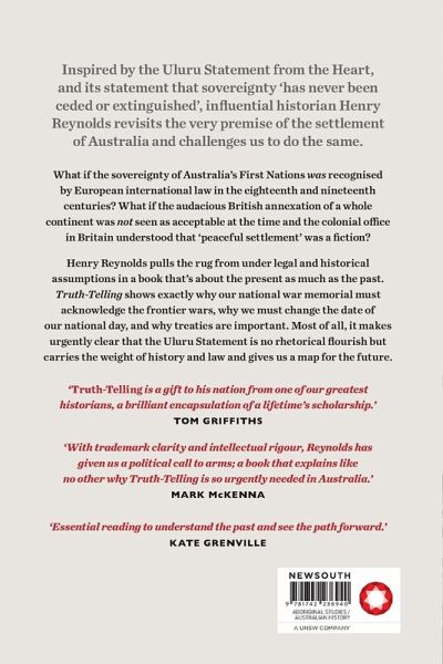 If we are to take seriously the need for telling the truth about our history, we must start at first principles. What if the sovereignty of the First Nations was recognised by European international law in the eighteenth and nineteenth centuries? What if the audacious British annexation of a whole continent was not seen as acceptable at the time and the colonial office in Britain understood that 'peaceful settlement' was a fiction? If the 1901 parliament did not have control of the whole continent, particularly the North, by what right could the new nation claim it? The historical record shows that the argument of the Uluru Statement from the Heart is stronger than many people imagine and the centuries-long legal position about British claims to the land far less imposing than it appears. In Truth-Telling, influential historian Henry Reynolds pulls the rug from legal and historical assumptions, with his usual sharp eye and rigour, in a book that's about the present as much as the past. His work shows exactly why our national war memorial must acknowledge the frontier wars, why we must change the date of our national day, and why treaties are important. Most of all, it makes urgently clear that the Uluru Statement is no rhetorical flourish but carries the weight of history and law and gives us a map for the future.