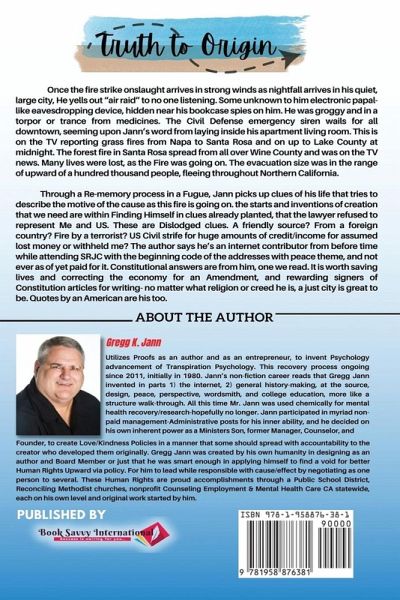 Once the fire strike onslaught arrives in strong winds as nightfall arrives in his quiet, large city, He yells out "air raid" to no one listening. Some unknown to him electronic papal-like eavesdropping device, hidden near his bookcase spies on him. He was groggy and in a torpor or trance from medicines. The Civil Defense emergency siren wails for all downtown, seeming upon Jann's word from laying inside his apartment living room. This is on the TV reporting grass fires from Napa to Santa Rosa and on up to Lake County at midnight. The forest fire in Santa Rosa spread from all over Wine County and was on the TV news. Many lives were lost, as the Fire was going on. The evacuation size was in the range of upward of a hundred thousand people, fleeing throughout Northern California. Through a Re-memory process in a Fugue, Jann picks up clues of his life that tries to describe the motive of the cause as this fire is going on. the starts and inventions of creation that we need are within Finding Himself in clues already planted, that the lawyer refused to represent Me and US. These are Dislodged clues. A friendly source? From a foreign country? Fire by a terrorist? US Civil strife for huge amounts of credit/income for assumed lost money or withheld me? The author says he's an internet contributor from before time while attending SRJC with the beginning code of the addresses with peace theme, and not ever as of yet paid for it. Constitutional answers are from him, one we read. It is worth saving lives and correcting the economy for an Amendment, and rewarding signers of Constitution articles for writing- no matter what religion or creed he is, a just city is great to be. Quotes by an American are his too.
