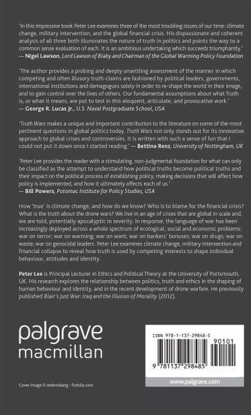 'Truth Wars makes a unique and important contribution to the literature on some of the most pertinent questions in global politics today. Peter Lee's new book really challenged my own thinking on what I thought was 'true' in the debates about climate change, drone warfare and the global financial crisis. I cannot wait to see my IR students engage with this thought-provoking analysis, which is guaranteed to lead to some heated discussions! Moreover, Truth Wars not only stands out for its innovative approach to global crises and controversies. It is written with such a sense of fun that I could not put it down once I started reading.' - Bettina Renz, University of Nottingham, UK