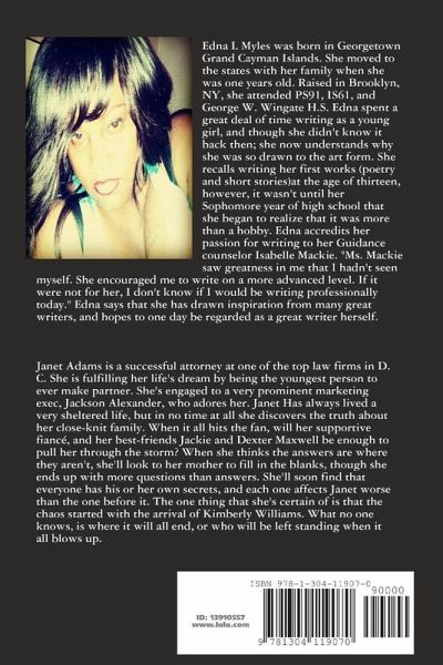 Janet Adams is a successful attorney at one of the top law firms in D.C. She is fulfilling her life's dream by being the youngest person to ever make partner. She's engaged to a very prominent marketing exec, Jackson Alexander, who adores her. Janet Has always lived a very sheltered life, but in no time at all she discovers the truth about her close-knit family. When it all hits the fan, will her supportive fiancé, and her best-friends Jackie and Dexter Maxwell be enough to pull her through the storm? When she thinks the answers are where they aren't, she'll look to her mother to fill in the blanks, though she ends up with more questions than answers. She'll soon find that everyone has his or her own secrets, and each one affects Janet worse than the one before it. The one thing that she's certain of is that the chaos started with the arrival of Kimberly Williams. What no one knows, is where it will all end, or who will be left standing when it all blows up.