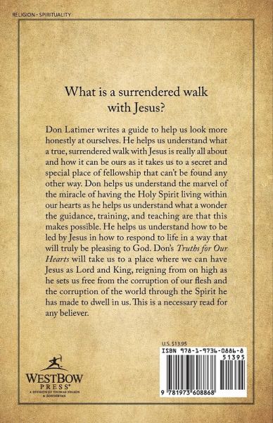 What is a surrendered walk with Jesus? Don Latimer writes a guide to help us look more honestly at ourselves. He helps us understand what a true, surrendered walk with Jesus is really all about and how it can be ours as it takes us to a secret and special place of fellowship that can?t be found any other way. Don helps us understand the marvel of the miracle of having the Holy Spirit living within our hearts as he helps us understand what a wonder the guidance, training, and teaching are that this makes possible. He helps us understand how to be led by Jesus in how to respond to life in a way that will truly be pleasing to God. Don?s Truths for Our Hearts will take us to a place where we can have Jesus as Lord and King, reigning from on high as he sets us free from the corruption of our flesh and the corruption of the world through the Spirit he has made to dwell in us. This is a necessary read for any believer.