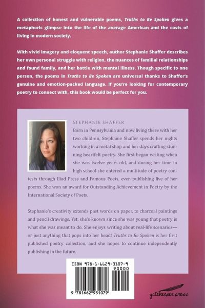 A collection of honest and vulnerable poems, Truths to be Spoken gives a metaphoric glimpse into the life of the average American and the costs of living in modern society. With vivid imagery and eloquent speech, author Stephanie Shaffer describes her own personal struggle with religion, the nuances of familial relationships and found family, and her battle with mental illness. Though specific to one person, the poems in Truths to be Spoken are universal thanks to Shaffer's genuine and emotion-packed language. If you're looking for contemporary poetry to connect with, this book would be perfect for you.