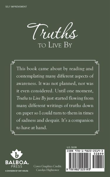 This book came about by reading and contemplating many different aspects of awareness. It was not planned, nor was it even considered. Until one moment, Truths to Live By just started flowing from many different writings of truths down on paper so I could turn to them in times of sadness and despair. It's a companion to have at hand.