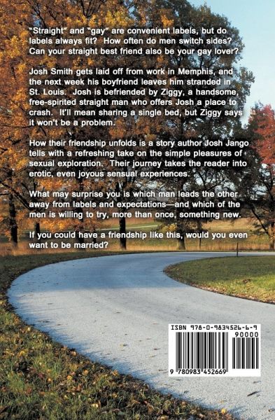 An uninhibited, seemingly straight young man, Ziggy, becomes sexually active with Josh, a shy, new-found gay friend. Josh has a lot more to offer someone than he's ever been able to show. Ziggy's generosity and genuine affection allow Josh to express feelings and desires he's never shared with anyone before. The friendship begins one early morning in St. Louis when Ziggy rescues Josh from a couple of bad characters. When daylight approaches, Zig offers Josh a place to crash -- and then proposes they share his little studio apartment and split the rent. The two young men seem to hit it off well from the start, despite their contrasting personalities. But can an honest and respectful friendship survive even one week of sharing such close quarters? And then there's the road trip to Memphis... As a forewarning, readers should understand that this novel contains some sexual scenes which are described in detail.