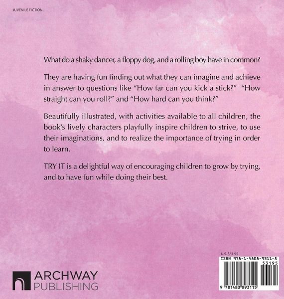 What do a shaky dancer, a floppy dog, and a rolling boy have in common? They are having fun finding out what they can imagine and achieve in answer to questions like "How far can you kick a stick?" "How straight can you roll?" and "How hard can you think?" Beautifully illustrated, with activities available to all children, the book's lively characters playfully inspire children to strive, to use their imaginations, and to realize the importance of trying in order to learn. TRY IT is a delightful way of encouraging children to grow by trying, and to have fun while doing their best.