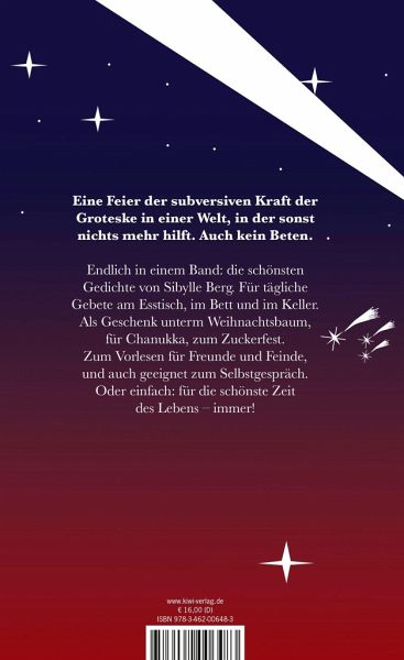 Endlich in einem Band: die schönsten Gedichte von Sibylle Berg. Für besinnliche Gebete am Esstisch, als Geschenk unterm Weihnachtsbaum, zum Vorlesen für die lieben Kinder am Abend, als lieben Gruß an den Ex-Freund oder den Hoffentlich-bald-Freund. Sozusagen ein Bukett für die schönste Zeit des Lebens: immer!