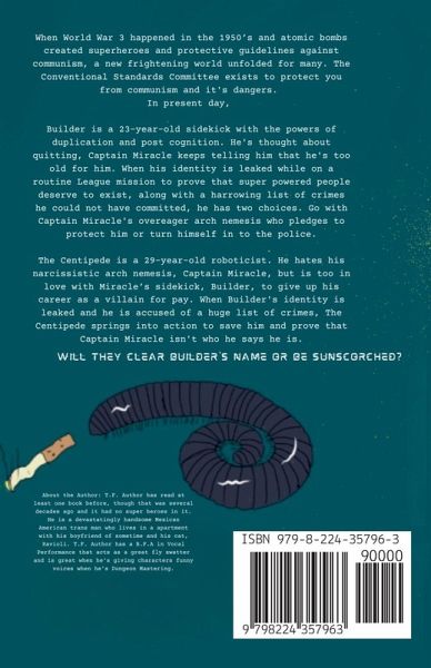 When atomic bombs flew back and forth forty years ago, superheroes were an unintended consequence In present day, Builder is a 23-year-old sidekick with the powers of duplication and post cognition. He's thought about quitting, Captain Miracle keeps telling him that he's too old for him. When his identity is leaked while on a routine League mission to prove that super-powered people deserve to exist, along with a harrowing list of crimes he could not have committed, he has two choices. Go with Captain Miracle's overeager arch nemesis who pledges to protect him or turn himself in to the police. The Centipede is a 29-year-old roboticist. He hates his narcissistic arch nemesis, Captain Miracle, but is too in love with Miracle's sidekick, Builder, to give up his career as a villain for pay. When Builder's identity is leaked and he is accused of a huge list of crimes, The Centipede springs into action to save him and prove that Captain Miracle isn't who he says he is. Will they clear Builder's name or will they be sunscorched?