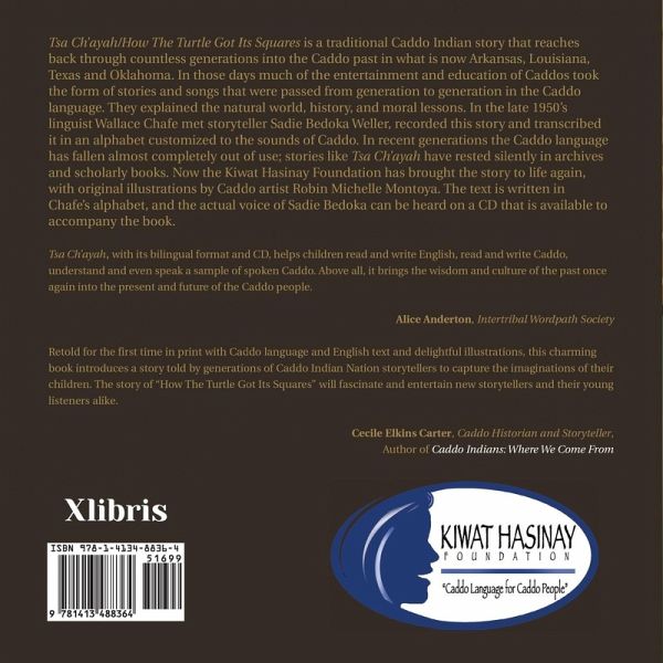 Bilingual Edition in English and Caddo Language How The Turtle Got Its Squares is a traditional Caddo Indian story that reaches back through countless generations into the Caddo past in what is now Arkansas, Louisiana, Texas and Oklahoma. In those days much of the entertainment and education of Caddos took the form of stories and songs that were passed from generation to generation in the Caddo language. They explained the natural world, history, and moral lessons. In the late 1950's linguist Wallace Chafe met storyteller Sadie Bedoka Weller, recorded this story and transcribed it in an alphabet customized to the sounds of Caddo. In recent generations the Caddo language has fallen almost completely out of use; stories like Tsa Ch'ayah have rested silently in archives and scholarly books. Now the Kiwat Hasinay Foundation has brought the story to life again, with original illustrations by Caddo artist Robin Michelle Montoya. The text is written in Chafe's alphabet, and the actual voice of Sadie Bedoka can be heard on a CD that is available to accompany the book. Tsa Ch'ayah, with its bilingual format and CD, helps children read and write English, read and write Caddo, understand and even speak a sample of spoken Caddo. Above all, it brings the wisdom and culture of the past once again into the present and future of the Caddo people. --Alice Anderton, Intertribal Wordpath Society Retold for the first time in print with Caddo language and English text and delightful illustrations, this charming book introduces a story told by generations of Caddo Indian Nation storytellers to capture the imaginations of their children. The story of "How The Turtle Got Its Squares" will fascinate and entertain new storytellers and their young listeners alike. --Cecile Elkins Carter, Caddo Historian and Storyteller, Author of Caddo Indians: Where We Come From