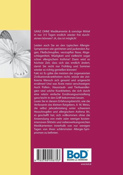 GANZ OHNE Medikamente und sonstige Mittel in nur 3-5 Tagen endlich wieder frei durchatmen können? JA, das ist möglich! Leiden auch Sie an den typischen Allergie-Symptomen wie geröteten und juckenden Augen, Fließschnupfen, verstopfter Nase, Abgeschlagenheit, Müdigkeit und vielleicht sogar schon allergischem Asthma? Dann wird es höchste Zeit, dass sich das endlich ändert, damit Sie nicht nur Frühling und Sommer wieder so richtig genießen können! Fakt ist: Es gäbe die meisten der sogenannten Zivilisationskrankheiten nicht, würde der zivilisierte Mensch sich gesund und artgerecht ernähren! Und was Ärzte meist verschweigen: Auch Pollen-, Hausstaub- und Tierhaarallergien sind solche Krankheiten, die sich durch eine relativ einfache Ernährungsumstellung ganz leicht in den Griff bekommen lassen. Lesen Sie in diesem Erfahrungsbericht, wie die Verfasserin des kleinen Ratgebers, A. M. Weiss, die selbst jahrzehntelang unter schwerem Heuschnupfen und allergischem Asthma litt, es geschafft hat, sich vollkommen ohne die Anwendung von mehr oder weniger kostenintensiven Mitteln und nebenwirkungsreichen Medikamenten innerhalb von nur wenigen Tagen von ihren schlimmsten Allergie-Symptomen zu befreien. Die Umsetzung der in diesem Buch enthaltenen Empfehlungen ist im Übrigen bei ALLEN Allergien angeraten!