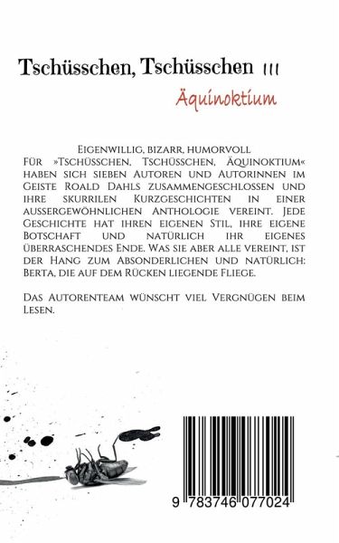 Eigenwillig, bizarr, humorvoll Für »Tschüsschen, Tschüsschen, Äquinoktium« haben sich sieben Autoren und Autorinnen im Geiste Roald Dahls zusammengeschlossen und ihre skurrilen Kurzgeschichten in einer außergewöhnlichen Anthologie vereint. Jede Geschichte hat ihren eigenen Stil, ihre eigene Botschaft und natürlich ihr eigenes überraschendes Ende. Was sie aber alle vereint, ist der Hang zum Absonderlichen und natürlich: Berta, die auf dem Rücken liegende Fliege.Das Autorenteam wünscht viel Vergnügen beim Lesen.