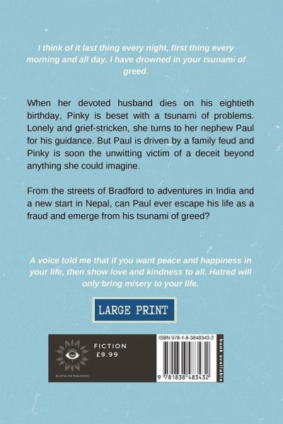 I think of it last thing every night, first thing every morning and all day. I have drowned in your tsunami of greed. When her devoted husband dies on his eightieth birthday, Pinky is beset with a tsunami of problems. Lonely and grief-stricken, she turns to her nephew Paul for his guidance. But Paul is driven by a family feud and Pinky is soon the unwitting victim of a deceit beyond anything she could imagine. From the streets of Bradford to adventures in India and a new start in Nepal, can Paul ever escape his life as a fraud and emerge from his tsunami of greed? A voice told me that if you want peace and happiness in your life, then show love and kindness to all. Hatred will only bring misery to your life.