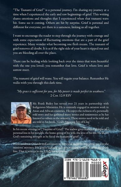 "The Tsunami of Grief" is a personal journey. I'm sharing my journey at a time when I experienced the early and raw beginnings of grief. This writing shares emotions and thoughts that I experienced when that tsunami wave hit. Some see it coming. Others are hit by surprise. Grief is personal and different for everyone, yet there is a sameness, linking us all together. I want to encourage the reader to step through the journey with courage and with some expectation of fluctuating emotions that are a part of the grief experience. Many wonder what becoming one flesh means. The tsunami of grief removes all doubt. It is as if the right side of your heart is ripped out and you are bleeding all over the place. There can be healing while looking back over the times that were beautiful with the one you loved; you remember that love. Grief is where love and sorrow meet. The tsunami of grief will wane. You will regain your balance. Remember He walks with you through this dark time. "My grace is sufficient for you, for My power is made perfect in weakness." 2 Cor. 12:9 ESV Mr. Frank Bailey has served over 21 years in partnership with Indigenous Ministries. He is currently engaged in mission work in Asian and African countries. He enjoys the richness of a personally told story and has gathered many stories and testimonies as he has listened to others in the ministry. These stories need to be told and are told in his book, "God's Amazing Jars of Clay." In his recent writings of "Tsunami of Grief," The author gives readers a glimpse of a personal loss in his own life, the home-going of his wife, the love of his life. He shares God's sustaining strength as he faced the tsunami of grief. Frank resides in Orlando and continues to write and maintain his connections to the missions' ministry. His goal is to finish well, not stopping until he reaches the finish line. That is written in the Lord's book. (Psalm 139)