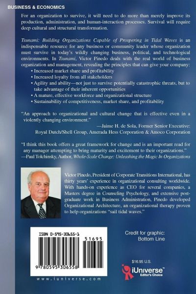 For an organization to survive, it will need to do more than merely improve its production, administration, and human-interaction processes. Survival will require deep cultural and structural transformation. Tsunami: Building Organizations that can survive Tidal Waves is an indispensable resource for any business or community leader whose organization must survive in today's wildly changing business, political, and technological environments. In Tsunami Victor Pinedo deals with the real world of business organization and management, revealing the principles that can give your company: Increased market share and profitability Increased loyalty from all stakeholders Agility and ability--not just to survive potentially catastrophic threats, but to take advantage of their inherent opportunities A mature, effective workforce and organizational structure Sustainability of competitiveness, market share, and profitability "An approach to organizational and cultural change that is effective even in a violently changing environment."--Jaime H. de Sola, Former Senior Executive: Royal Dutch/Shell Group, Amerada Hess Corporation & Amoco Corporation "I think this book offers a great framework for change and is an important read for any manager attempting to bring maturity and excitement to their organizations."--Paul Tolchinsky, Author, Whole-Scale Change: Unleashing the Magic In Organizations