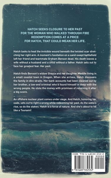 Hatch seeks closure to her past For the woman who walked through fire Redemption comes at a price For Hatch, that could mean her life. Hatch looks to heal the invisible wound beneath the twisted scar stretching her right arm. A moment's hesitation on a sand-swept battlefield left her friend and teammate Graham Benson dead. His death leaves a wife without a husband and a child without a father. Hatch sets out to face her greatest fear. Her past. Hatch finds Benson's widow Shayla and her daughter Maddie living in a small coastal town in Oregon. When she arrives, Hatch discovers the family in dire straits. Her bank accounts had been cleaned out by her brother, a low-end criminal who'd found himself in deep with the wrong people. He stole the money with promises of returning it after a big score. An offshore nuclear plant comes under siege. And Hatch, honoring her code, sets out to right a wrong while redeeming her past. As the waters rise, so do the stakes. Hatch is a force of nature. And she's about to hit like a Tsunami!