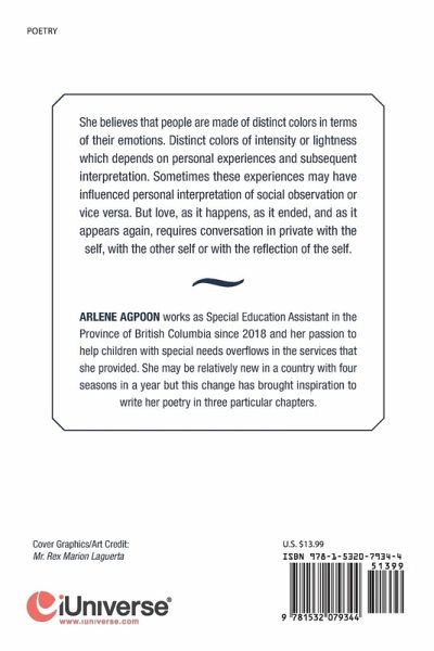 She believes that people are made of distinct colors in terms of their emotions. Distinct colors of intensity or lightness which depends on personal experiences and subsequent interpretation. Sometimes these experiences may have influenced personal interpretation of social observation or vice versa. But love, as it happens, as it ended, and as it appears again, requires conversation in private with the self, with the other self or with the reflection of the self.